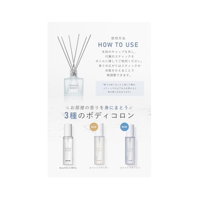 【 HOW TO USE 】本体のキャップを外し、付属のスティックをボトルに挿してご使用下さい。本数を変えて微調整できます。香りが弱くなったと感じた際は、スティックの上下を入れ替えると再び香りが広がります。