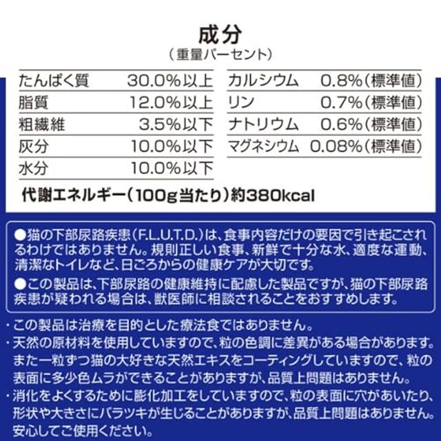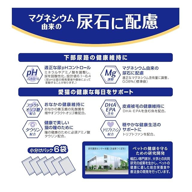 ●猫の臨床栄養学から生まれた下部尿路の健康維持フード。<br><br>●マグネシウムとカルシウムの適正バランスで尿pHをコントロール。<br><br>●愛猫の活力のために「ヨード卵・光」配合。<br><br>●穏やかな健康生活のためにトリプトファンを配合。<br><br>●マグネシウム由来の結石に配慮。<br><br>●おなかの善玉菌の乳酸菌を増やすフラクトオリゴ糖配合。<br><br>●尿pH設計値6.1~6.4<br><br>●マグネシウム含有量0.08%(標準値)<br><br>●国産・無着色で便利な小分けパック。 ■更新日時:2025/04/30 15:06:08
