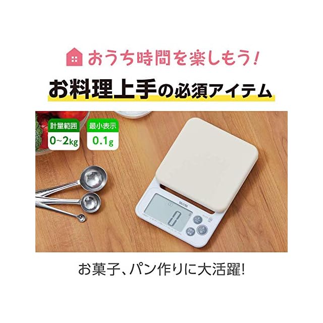 タニタ(Tanita) クッキングスケール シリコンカバー付き 最小表示0.1g 最大計量2kgまで計れる 収納に便利なフック穴付き デジタル はかり ホワイト KJ-212 WH