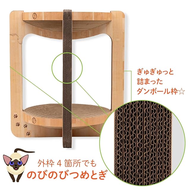 【タワー全体がつめとぎに】 ベッド部分だけでなく、立ち上がってのびのびつめとぎがしたいタイプの猫の希望も叶えます。 ダンボールでできた枠部分の縦ラインもつめとぎ仕様になっています。 外側から立ち上がってのびのび研ぐもよし、つめとぎベッドでゴロゴロしながら研ぐもよし。 タワー全体を余すことなくご使用いただけます。