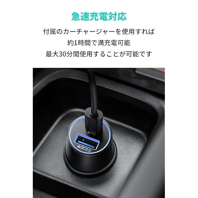 車内で急速充電:カーチャージャーが付属し、1時間で満充電することが可能です。最大30分間の稼働時間で車内全体を掃除できます。