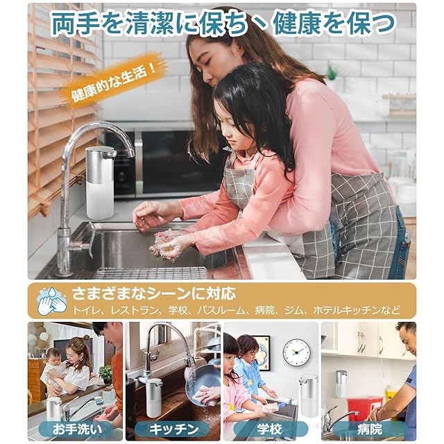 「自動ソープディスペンサー」。赤外線センサ技術を採用し、手をかざすと赤外線センサーが感知して適量のソープが自動的に出てきます。操作簡単、使用便利。汚れた手で直接ポンプに触る必要がないため、衛生的で、周りが汚れにくいです。非接触式で二回目感染を避けて、ウイルス予防の対策です。