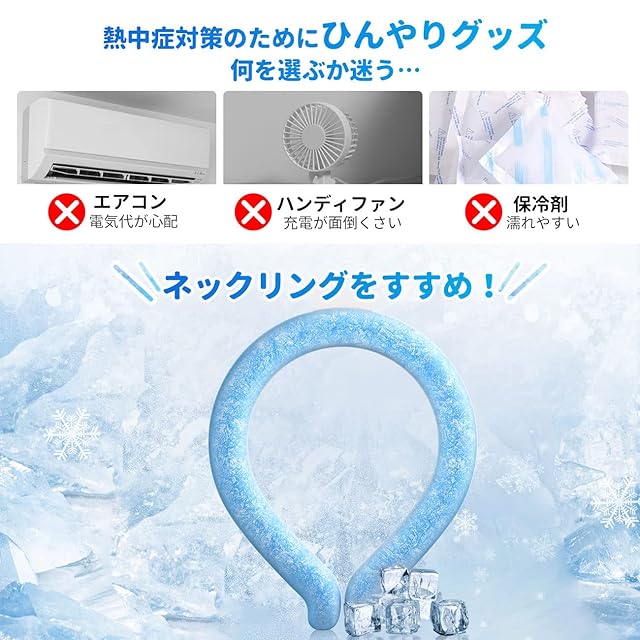【使い方法簡単&冷感が長時間続く】 このアイスネックリングは首にかけるだけ、使えます。また、首には大動脈があり、この部分を冷やすと全身に流れる血液を冷やすことができる為、全身を効果的にクールダウンし熱中症予防の効果が見込めます。