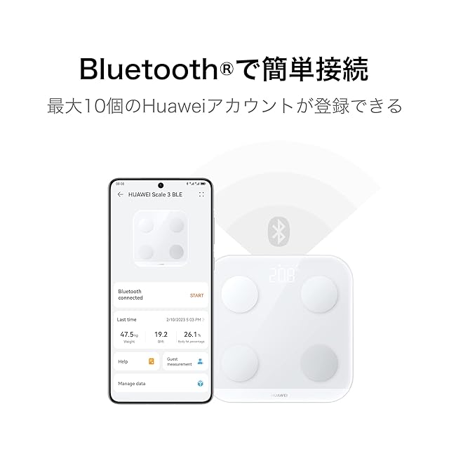 【専用アプリ対応】:「HUAWEI Health」アプリとBluetooth接続し、週、月、年単位で体重、体脂肪率、骨格筋量の変動推移をグラフで確認可能