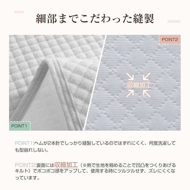 【Keusnixおすすめスタイル】本商品の裏面には一般的な細かいキルトをしているものとは異なり、収縮加工(※熱で生地を縮めることで凹凸をつくりあげるキルト)をかけることで、敷き布団、ベッドマットでツルツル滑ることがございません。また、細かいキルトでポコポコの小さな山をつくって、体との密着を防ぎ通気性があり快適です。※タオル地の敷きパッドは冬でも使える反面、真夏はどうしても暑く感じてしまいます。そんな時期はエアコンとの併用をおすすめします。