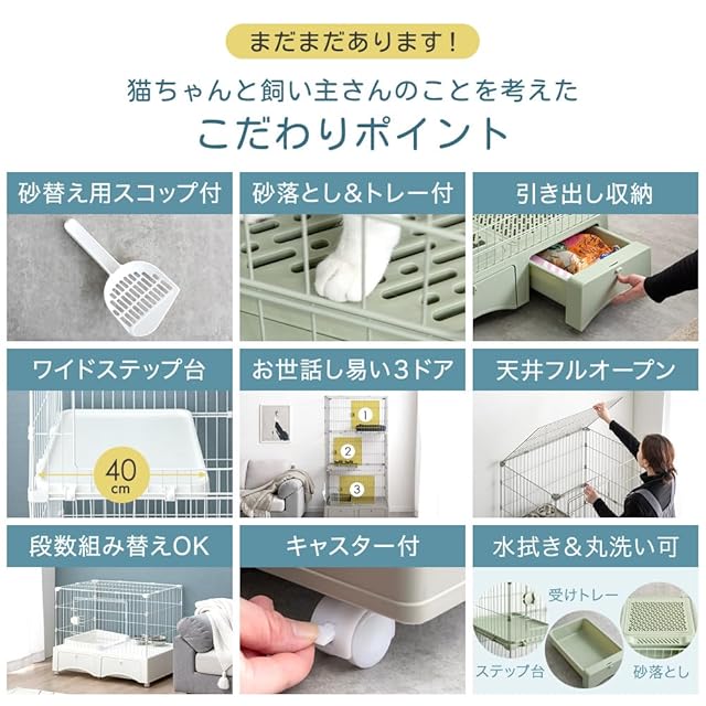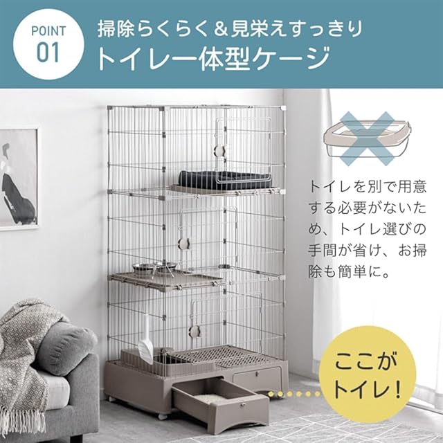【スタッフのおすすめポイント】 ・ケージとトイレが一度に揃う! トイレ一体型キャットケージ ・扉を閉めたまま砂替え/お掃除OK ・ガード付きで砂飛びしにくい ・すっきり片付く引き出し収納 ・ベッドも置けるワイドステップ台 ・お世話しやすい3ドア+フルオープン天井 ・成長に合わせて選べる段数 ・移動に便利なキャスター付き ・おしゃれなワントーンデザイン