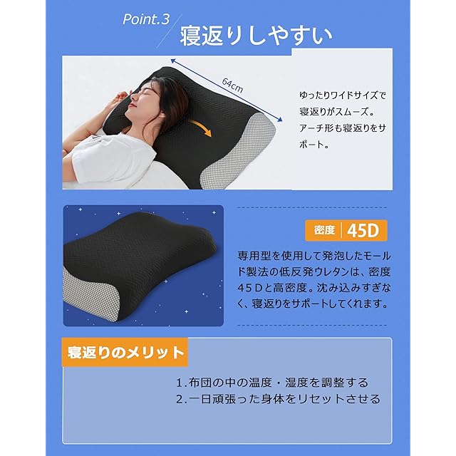 【寝返りが楽】横幅は64cmもある大きめの枕です。大きいサイズで安心感があり、枕から頭が落ちる事がなく、朝まで安眠です。また枕の密度は45Dもあり、沈み込みすぎなくて、寝返りをサポートしてくれます。