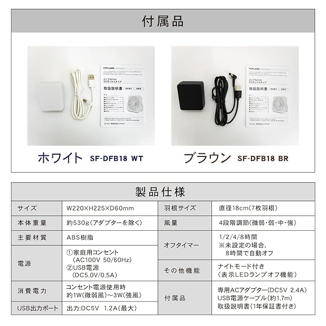 【商品仕様】◇本体サイズ:幅22×奥行6×高さ22.5cm ◇本体重量:約530g ◇電源:①家庭用コンセント電源(AC100V 50/60Hz) ②USB電源(DC5.0V/0.5A) ◇消費電力:1W(最小)~3W(最大)、充電出力ポート:出力DC5V 1.2A(最大)、USB充電ポート:DC5.0V 1.2A(最大) ◇風量調整:4段階(微・弱・中・強) ◇角度調節:上45°(手動) ◇オフタイマー:1・2・4・8時間(未設定の場合、8時間で自動オフ) ◇付属品:専用ACアダプター、USB電源ケーブル(コード長:約1.7m)、取扱説明書(書) ◇期間:お買い上げ日より1年間(の範囲については、取扱説明書をご確認ください。(一般家庭用以外(業務用など)に使用された場合の故障及び損傷などは対象外となります))