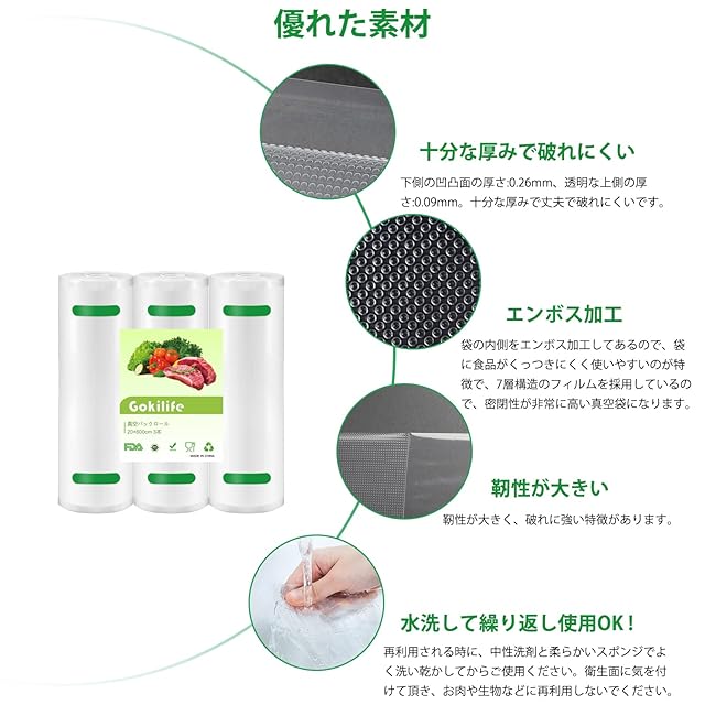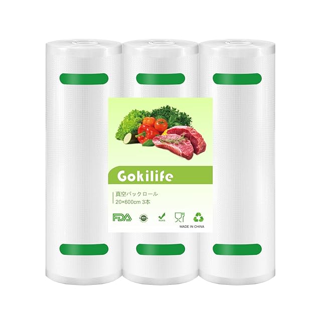 商品名:Gokilife 真空パック袋 真空パックロール 20*600cm 3本セット - 真空パック機専用ロール 替えロール 真空ビニール エンボス加工 真空包装袋 専用抗菌袋 脱気密封 鮮度長持ち 食品保存 低温調理 PA+PE安全素材 自由にカット 家庭用 業務用