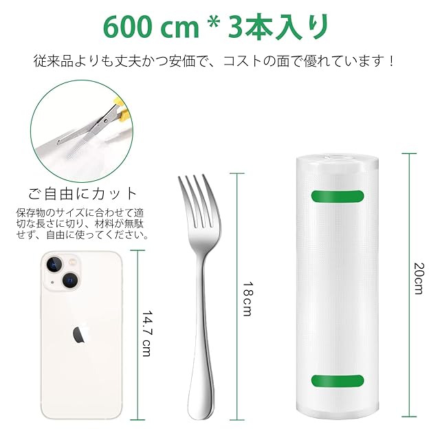 【自由に調整可能】 サイズ:20*600cm*3本セット 重さ:約700g 耐熱温度:110° 耐寒温度:-40°、小分けされた真空パック袋とは異なり、長さはハサミで自由に調整できます。必要な長さを決められ、資源の浪費も削減できます。