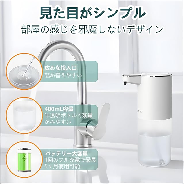 【400ml&詰め替えやすい】このハンドソープマシンはたっぷりの400mlタンクを搭載しているため、頻繁に補充する必要がありません。半透明ボトルなので、ソープ残量がみやすい上に、どんな色のソープを入れてもデザイン性を損ないません。投入口も広めなのでソープを詰め替えやすい。