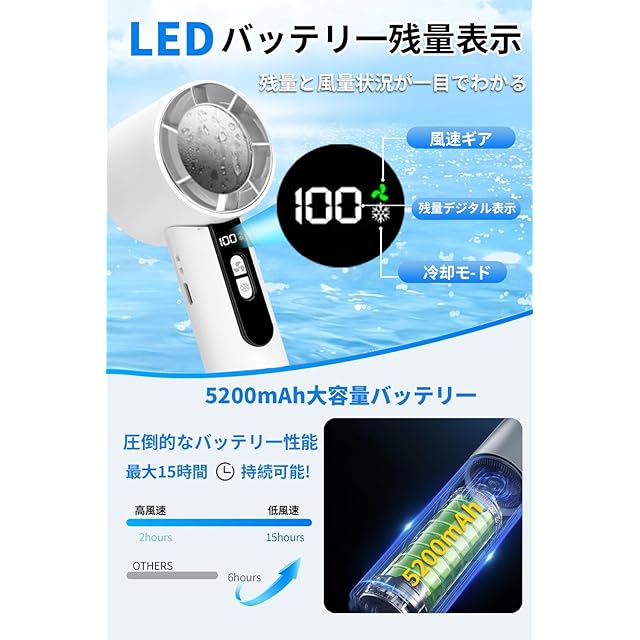 【5200mAh大容量バッテリー・LEDバッテリー残量表示】このハンディ扇風機は、大容量な5200mAhバッテリーを搭載しており、長時間の使用も安心です。さらに、便利なType-C充電方式を採用していますので、充電も簡単で持ち運びも楽々です。外出中でも電源切れことを心配入れません。いつでもどこでも夏の涼しさを楽しみます。ファンにはデジタル表示画面があり,現在の風速とバッテリ電力量を表示でき,残電力量の追跡に便利である。ミニ扇風機なのに優れモノです!