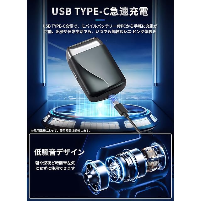 【TYPE-C急速充電】国際標準インタフェース付きUSBの充電方法を採用、PCやモバイルバッテリーや自動車USBポートから充電できるミニ髭剃り 電動シェーバーです、アダプタ(5 V/1 A)を接続して自宅のコンセントで充電することもでき、出張、旅行、オフィスでも電力がなくなる心配はありません。1.5時間だけで充電でき、最長100分間使用可能、より早く、より長く使用できます。