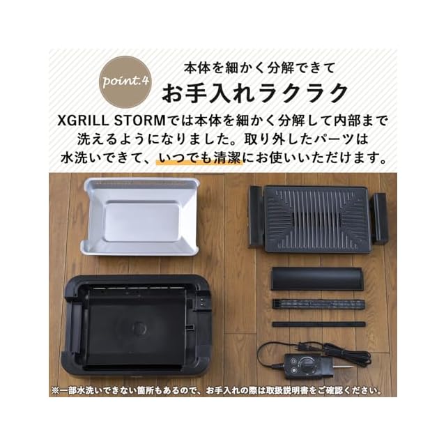 【簡単お手入れ】XGRILL STORMでは本体を細かく分解して、内部まで洗えるようになりました。取り外したプレート(差込口側取っ手以外)、ファンユニット(電極ピン、モーター部以外)、遮熱板、ファンカバー、送風ガイド板、フィルターは丸洗いでき、いつでも清潔な状態でお使いいただけます。さらに、プレート表面・裏面にはこびりつきにくく、汚れてもサッととれるフッ素コーティングが施されており、簡単にお手入れできます。