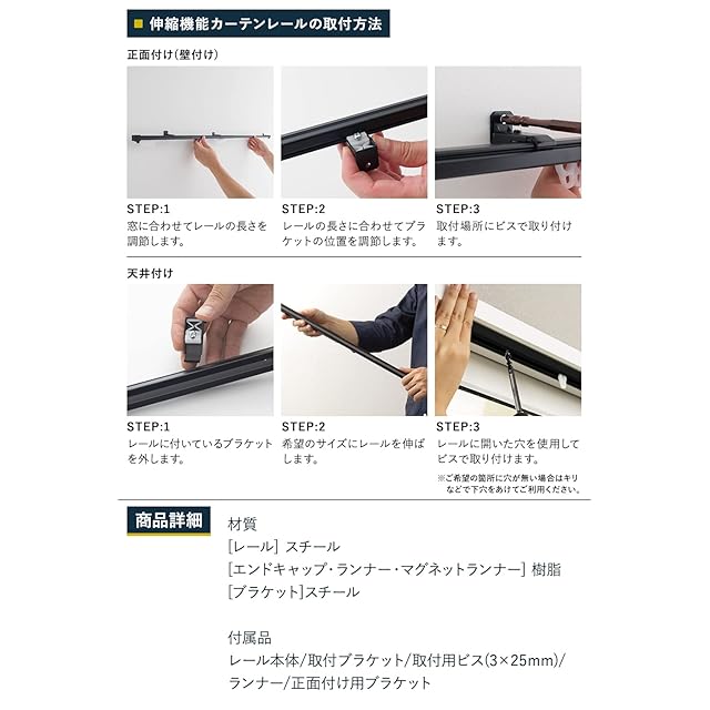 【伸縮サイズ】0.6-1.0m【カラー】ブラック 【材質】レール本体&ブラケット:スチール/エンドキャップ・ランナー・マグネットランナー:樹脂