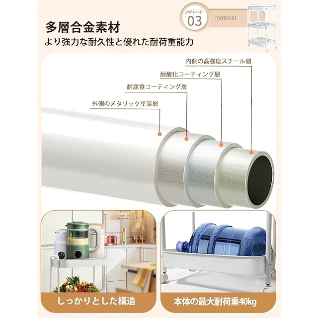 【頑丈な合金構造と通気性に優れたメッシュデザイン】この収納ラックは、ABS樹脂を使用した一般的なラックと比べ、はるかに頑丈で耐久性に優れた合金素材と金属コーティングを採用しています。これにより、より安定した組み立てが可能で、耐荷重性能もABS素材の約5倍に達します。さらに、メッシュ構造になっているため、収納した物の通気性を保ち、水分がたまらず、特に野菜や果物などの食品を新鮮に保つことができます。通気性が良いので、臭いがこもる心配もありません。
