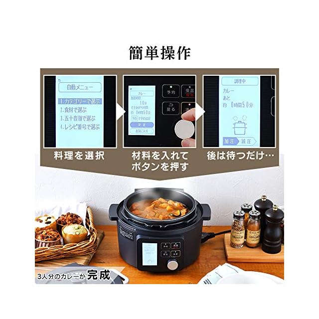 【ボタンを押すだけ3STEP】1.料理を選択 2.材料を入れてボタンを押す 3.あとは待つだけ!火を使わないので目を離していても安全。待っている間に他の調理や家事もできます。
