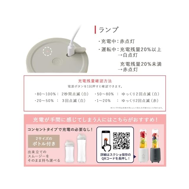 コードレスで持ち運びOK!氷も砕ける便利性能。(※氷は2.5cm角未満。) いつでも手軽に作りたてで新鮮なスムージーが出来上がる。【USB充電でいつでもどこでも使える】1回のフル充電で約16回使用可能。(※1回35秒使用の場合。)定格電圧:DC 7.4V / 電源:リチウムイオン電池 / 充電池容量:1300mAh / 充電入力:DC 5V、1A / 充電時間:約3時間付属品:USBケーブル(TypeA-TypeC:長さ約1m)(※ACアダプターは付属していない。充電時は、DC 5V/1AのPSE適合品を使用すること。)