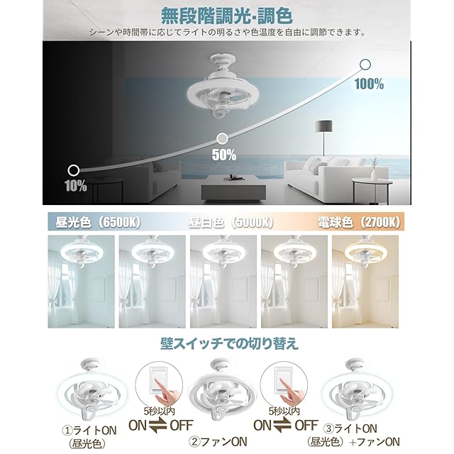【長寿命で省エネなLED搭載・無階段調光調色・リモコン付き】ファン付きシーリングライトは高品質なLEDライトを搭載して、リモコンで「輝度」「CCT」ボタンを長押してお部屋の雰囲気やシーンに合わせて純正色温度3000K〜6500Kの昼光色・昼白色・電球色の3色温度10%〜100%までの無階段切替が可能です。安定したLED全光束4000LMの明るさを提供し、耐用年数 50,000時間に達し、5年間交換不要で、省エネで長寿命を実現!色と明るさの変化に応じて部屋に良い雰囲気を作り出すことができます。寝室、リビングルーム、台所、廊下、書斎、玄関、トイレ、オフィスなど様々なシーンで活躍です。