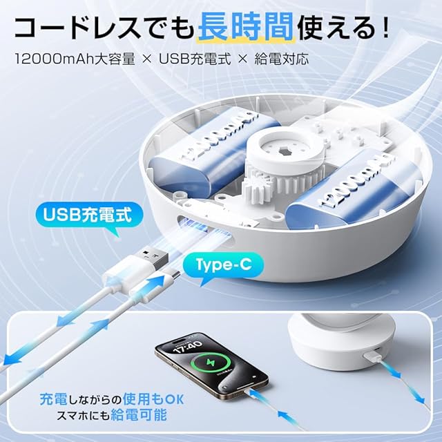 【12000mAh大容量バッテリー内蔵|最大27時間連続使用】 サーキュレーター には、12000mAhの大容量バッテリーを内蔵した 充電式サーキュレーター です。フル充電で最大27時間連続稼働が可能で、停電時やアウトドア、キャンプでも大活躍。小型扇風機 コードレス タイプながらパワフルな送風を実現し、リビングや寝室、キッチンなど様々なシーンに対応。長時間使用でも安心な コードレス扇風機 としておすすめの サーキュレーター です。