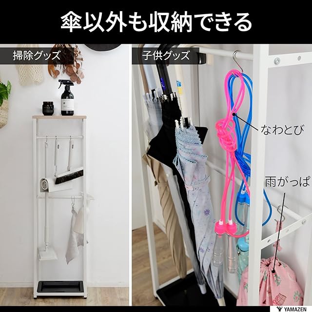 【70cm傘対応】大きめの70cmの傘にも対応しています。傘の他にも、お子様の縄跳びや砂場用の外遊びグッズ、ほうきやちりとりなどの掃除グッズの収納にもオススメです。S字フックが3個付いているので引っ掛けて収納できます。