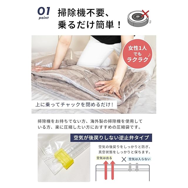 【掃除機不要!乗るだけでラクラク圧縮】 布団や衣類の収納に面倒な作業はもう不要。掃除機なしで、袋の上に乗るだけでしっかり空気を抜いて圧縮完了。誰でも簡単に使える、時短&ストレスフリーな圧縮袋です。