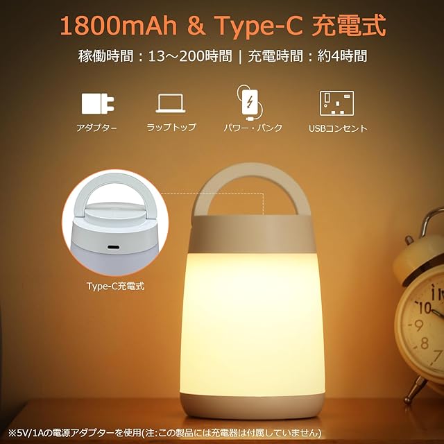 【1800mAhバッテリー容量・残量表示】 ナイトライトはType-C急速充電設計で、約4時間でフル充電され、1回の充電で13~200時間連続点灯が可能です。 LED指示ランプによってバッテリーの残量を確認したり、充電のタイミングを把握することができます。充電しながら使えますので大変便利です。*5V/1Aの電源アダプタを使用してください。(★注:この製品には充電器は付属していません)