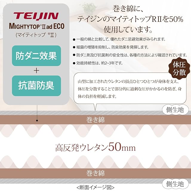 【「マイティートップⅡECO」を使用】中綿には防ダニの高機能素材、帝人のマイティトップⅡを採用しており、お子様がいるご家庭や、アレルギーなどが心配な方におすすめです。防ダニ・抗菌防臭機能があるテイジン「マイティートップⅡECO」が50%使用されています。