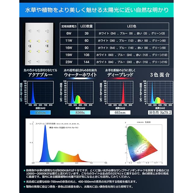 【39個高輝度LEDライト】39個高輝度LEDランプを使用して、従来の水槽ライトと違い、照射は水槽の奥行き全体まで明るく照らす。LEDの光の安定性がよく、物の本色が現れ、観賞魚を飼うことと水草を育成することに最適です。