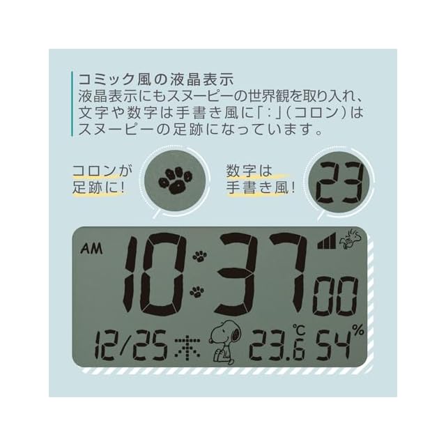 【数字や液晶デザインもコミック風にアレンジ】液晶表示にもスヌーピーの世界観を取り入れ、文字や数字は手書き風に、よく見ると「:」(コロン)はスヌーピーの足跡になっています。