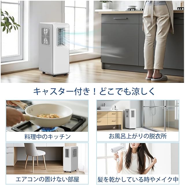 すぐに使えて、どこでも涼しく[工事不要]<br> 冷風/送風(換気)/除湿<br> キャスター付きでどこでも好きな場所へ移動できる。<br> エアコンが設置できない部屋もかんたんに涼しく。<br> <br> ◆さまざまなシーンで活躍<br> 料理中に暑くなってしまうキッチンに。<br> 工事の手間をかけずにすぐに使えて移動も可能。<br> エアコンが設置できない場所でも快適に。<br> <br> ◆使いやすい充実の機能 冷風:温度は16℃~30℃に設定可能。暑さで悩んでいたシーンも解決!<br> 送風:お部屋の換気を効率化、扇風機の代わりにも。<br> 除湿:じめじめした湿気を減らし、心地よい空間をつくります。<br>