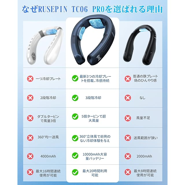 【夏冬両用首かけ扇風機】RUSEPIN 全新首かけ扇風機、送風モード、冷却モードと加熱モードの3way機能が備えて、季節に問わず通年使えます。熱伝導率と反射性の高いアルミプレートが瞬時に加熱冷却を開始し、約1秒でひんやり感とポカポカさを感じることができます。温度がMAX-12℃急冷され、冷たいカンを肌に密着させているようなひんやり感が首から伝わっていき、猛暑でも快適に過ごせます!