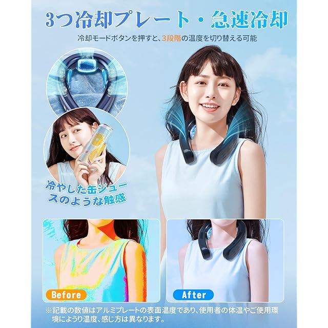 当社の首掛け扇風機は、3段階送風モード、3段階冷却モードと3段階加熱モードの3way機能が備えて、季節に問わず通年使えます。アップグレード版の首後部の冷却プレートは、業界標準を遥かに超える150%の冷却面積拡大を実現。熱伝導率と反射性の高いアルミプレートが瞬時に加熱冷却を開始し、約1秒でひんやり感とポカポカさを感じることができます。温度がMAX-19℃急冷され、冷たいカンを肌に密着させているようなひんやり感が首から伝わっていき、猛暑でも快適に過ごせます!