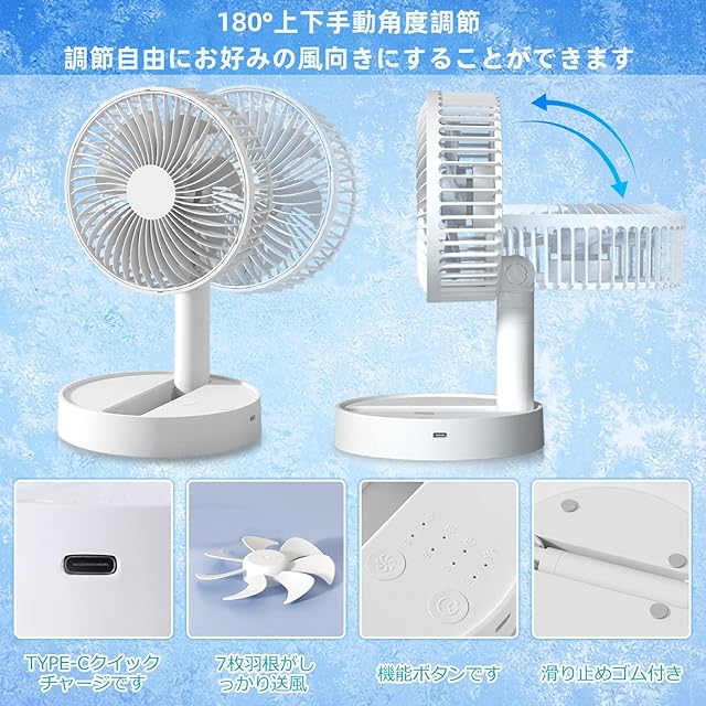 商品名:Gegizun 卓上扇風機 小型 折り畳み式 高さ調整可能【2025新登場】USB充電式 4000mAhバッテリー内蔵 大風量4段階調節 タイマー4段階調節 携帯扇風機 静音 コードレス ミニ サーキュレーター 軽量便利 省エネ 強力 キャンプ/アウトド/宅内/オフィス/車の中/洗面所 熱中症対策 ホワイト