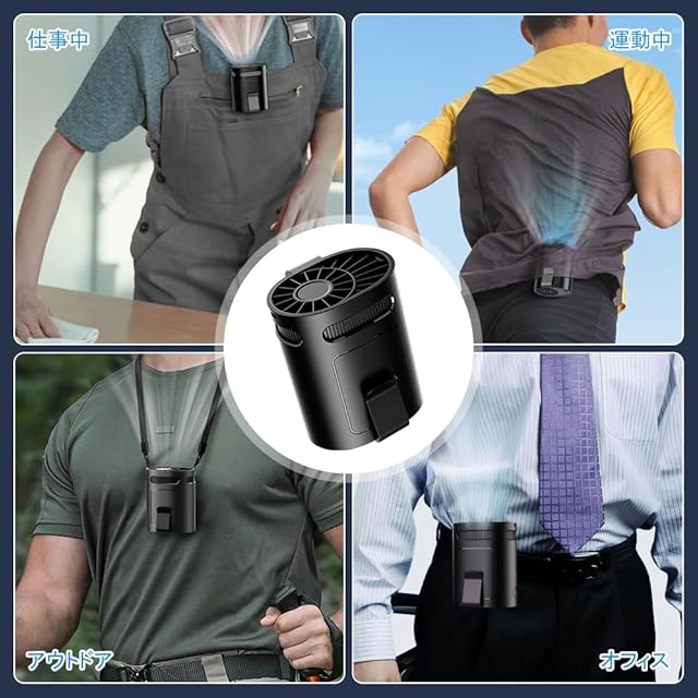 【一台多役、とても便利】この扇風機は腰掛け、首掛け、手持ち、卓上4つの使い方があります。ベルトクリップをベルトに挟み、ベルト掛けて使用することができます。付属のストラップを使用すると、首掛け式扇風機になります。そのまま手持ちや卓上において使用するのもオーケーです。コンパクトで、持ち運びやすく、とても便利です。