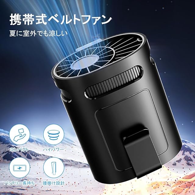 商品名:ベルトファン 腰掛け扇風機 携帯扇風機 ウエストファン 小型扇風機 ベルト掛け 首掛け 手持ち 3000mAh 4段階風量調節 USB充電式 コンパクト 超軽量 強力 大風量 工事 アウトドア スポーツ 登山 室内/室外作業 旅行用 熱中症対策