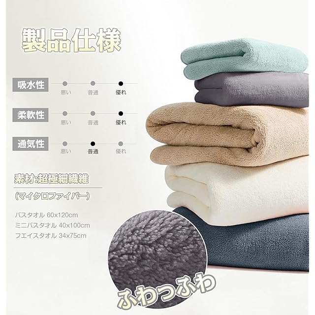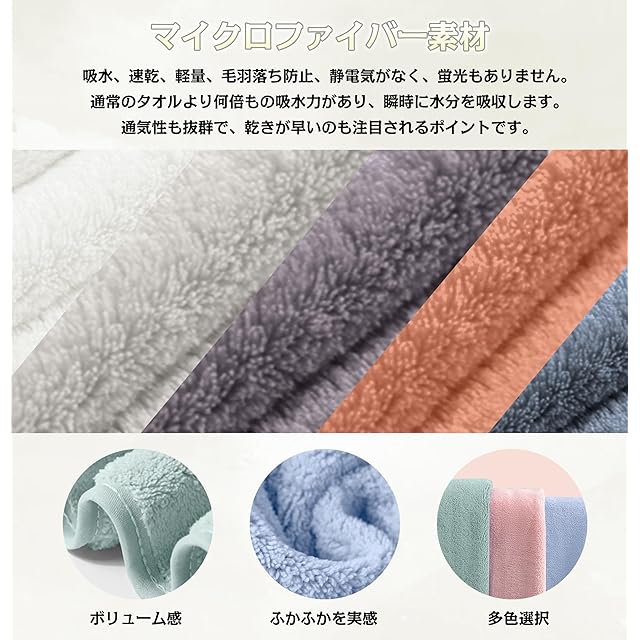 【マイクロファイバー素材】丁寧に織り上げた高品質極細繊維です。一般的なマイクロフアイバ-のタオルと比ベて約2倍以上のボリュ-ムがあり、ふんわりと包み込まれるようなリッチな使い心地。両面ともに厚手なのが機能性がさらにアップです!特徴:吸水速乾、軽量、糸抜け防止、通気性が強い、静電気なし、蛍光なし。想像を超えるふわっふわの触り心地なので、大人だけでなく敏の肌も每日を心地よく包みこみます。