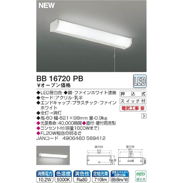 商品名:コイズミ LED流し元灯 直付・壁付両用型 昼白色 BB16720PB