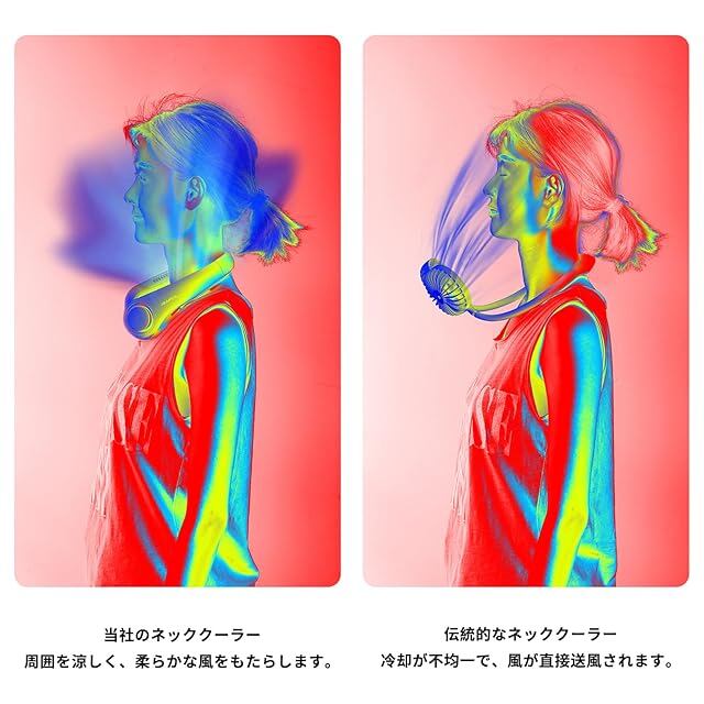 【360°送風の首かけ扇風機】最新的なネッククーラー。 周りに78個の吹き出し口を採用しており、全体に送風される。羽のない設計で、小さなお子供さんや高齢者の方にも安心してお使いいただけます。 暑い夏の日に最適です。