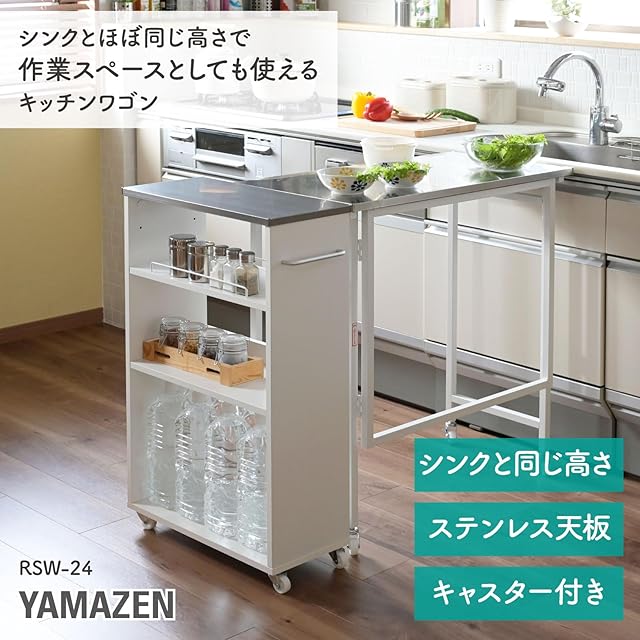 山善(YAMAZEN) ワゴン キッチンワゴン キャスター付き 4段 (ステンレス天板耐熱温度 : 200度) 幅24×奥行50(取っ手含む奥行53)×高さ85cm 収納 ラック 組立品 ホワイト RSW-24(WH)