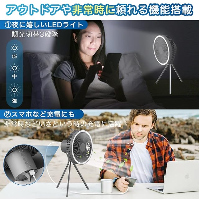 商品名:【オシャレで高性能&10000mAh】 キャンプ扇風機 充電式扇風機 アウトドア扇風機 3脚 コードレス 静音 切タイマー 風量3段階調節 LEDライト Type-C充電式 上下風向調節 吊り下げ 大風量 小型 卓上 キャンプ リビング 熱中症対策 直径18cm ダークグレー