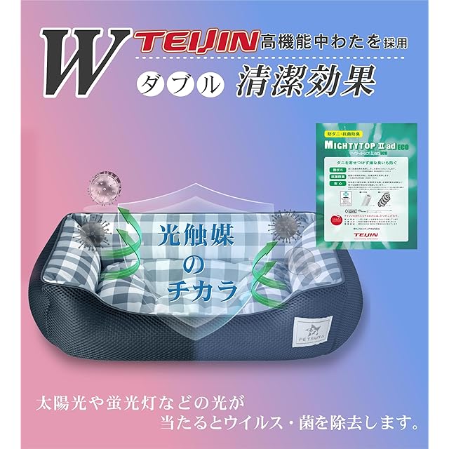 【極冷感生地・消臭+制菌】猫 犬 ベッドの内側には従来品の2.5倍である接触冷感Q-max値0.45のひんやり生地に、消臭、制菌、防臭・防ダニ効果のある光触媒をコーティング加工。お部屋の明かりや常夜灯の光だけで触媒反応を起こす光触媒だから、清潔効果が長く続きます。ひんやりペットベッドは蒸し暑い夏でも涼しく清潔で快適に眠れます。