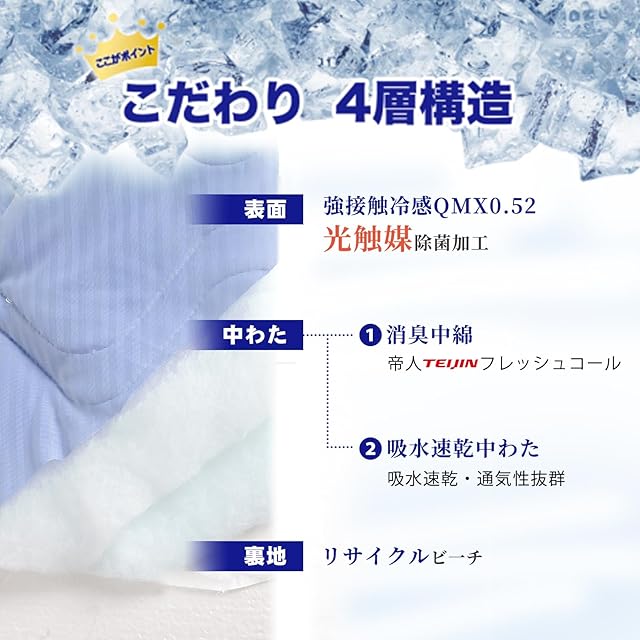 【4層構造敷きパッド】①表『強冷感』『柔らかい』スムース生地+②『シルクタッチ』中わた+③特別開発した繊維の「吸水速乾」中わた+『通気性クッション性良い』『抗菌防臭』中わた+④「爽やか」裏地リサイクルピーチ。