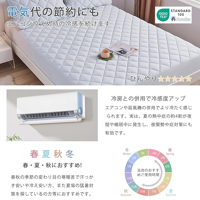 ❄【安全証明&節電需要】エコテックスは、世界最高水準の繊維製品の安全性をはじめ、環境や働く人にも配慮した生産体制がとられているかを厳しくチエックする、人と地球に優しい繊維製品の証明です。Aookaボックスシーツは「エコテックス」に合格しました。まだ、冷感シーツは電気代の節約には効果的で、エアコンや扇風機と併用して冷感がアップします。また、夏暑にはエアコンの設定温度も低くなリ必要がないだけでなく、エアコンを控えめ時の冷感を続けますし、すごく電気代の節約も出来ます。