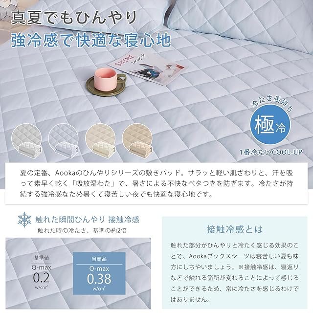 ❄【Q-MAX0.38 強冷感&吸水速乾】生地に触れた時の冷感は、肌から生地への熱移動によって発生します。Q-MAXはこの熱移動量を数値化したもので、数値が高いほど冷たく感じることができます。強冷感の秘密は素材自体の特性で、Q-MAX0.38の高いQ-max值があり、触った瞬間ひんやりで、熱の拡散が早いので、ひんやり感が早く回復できます。冷感マットレスは短時間で効果を実感しますし、体感温度約-10℃できます。または、ムレた空気を上手に逃がす秘密は吸湿性·放湿性抜群な多層構造で、汗をしっかりと吸収します。梅雨時の湿気対策もできます。