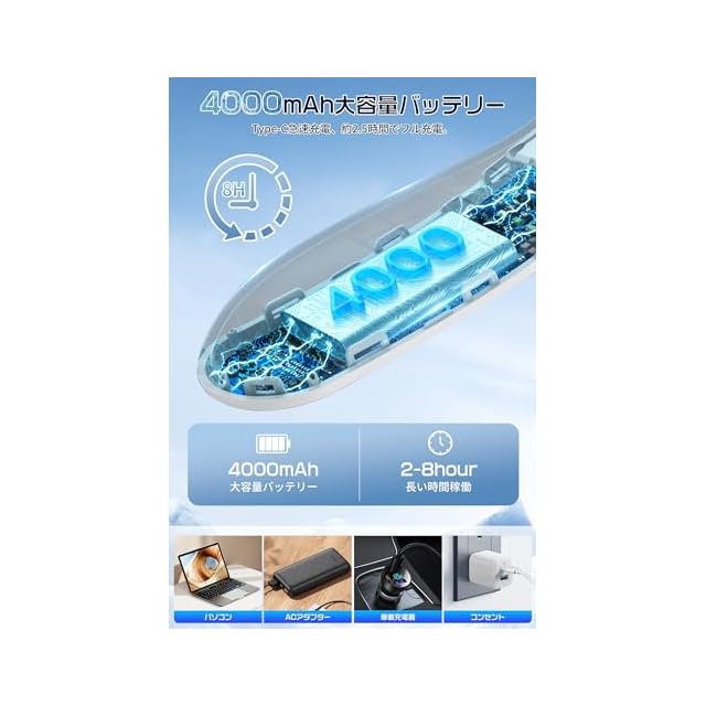 【4000mAhバッテリー&USB充電式】首掛けエアコンは4000mAhの大容量バッテリーを搭載しており、フルの充電で約9時間の稼働が可能で、長時間の屋外作業や野外イベントでも安心です。また、わずか2-4時間でフル充電が完了します。頻繁的に充電の手間がないので、アウトドアや長旅でも安定した涼しさを維持しながら十分な電力を確保できます。首掛け扇風機の側面にLEDスクリーンを搭載しているので、バッテリー残量や運転モードが一目瞭然です。付属のUSBケーブルで簡単に充電できるため、多様な充電方式で充電できます。外出時でも快適にお過ごしいただけます。