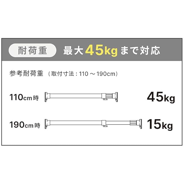 【耐荷重】110cm時 45kgまで / 190cm時 15kgまで【本体重量】0.91kg【カラー】ホワイト