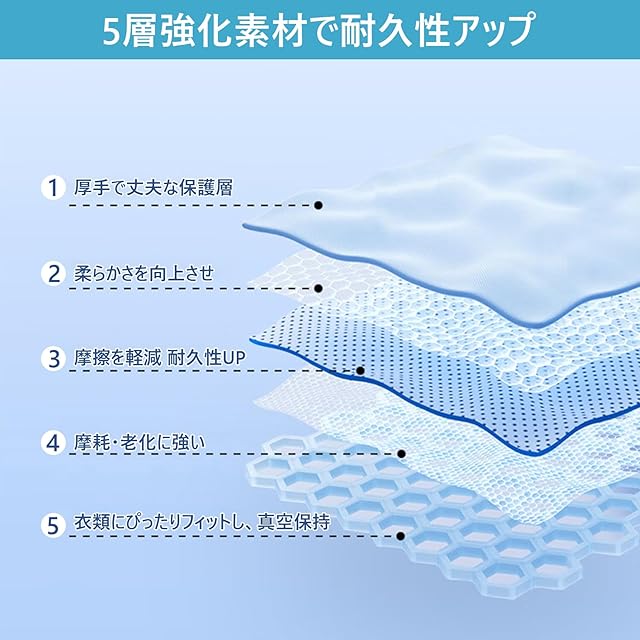 【7ミクロンの厚さで40%強化!】 圧縮袋には高耐久性のあるPA/PE素材を採用。この素材は、引張強度と耐久性に優れ、使用中の破れや空気漏れを効果的に防ぎます。本製品は7ミクロン(7si)で、市場によく見られるPET/PE素材や5ミクロン厚の圧縮袋と比べて約40%厚く、より頑丈で長期間安心して使えます。