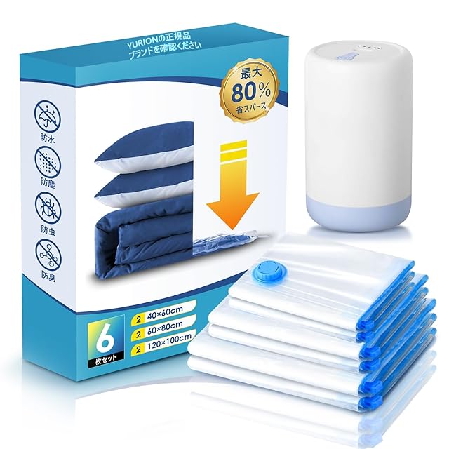 商品名:Yurion 布団圧縮袋 【6枚組/旅行に】 掃除機不要 衣類圧縮袋 コードレス電動ポンプ付き 120×100cm 2枚/60×80cm 2枚/40×60cm 2枚 真空 布団 衣類 毛布 洋服 ふとん 特大サイズ 真空収納袋 収納圧縮袋 電動エアポンプ 高密封性 防湿 防塵 防臭 防カビ 圧縮パック ダニ対策 収納/引越し/衣替え/出張/旅行用