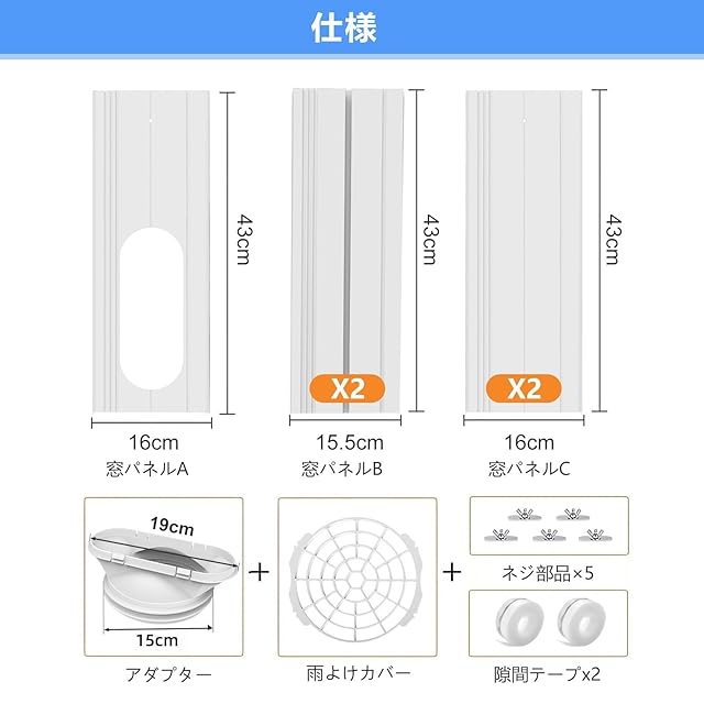 窓用ダクトパネル 5枚セット 窓枠高さ43~191cm対応 直径13cm&15cm排気ホース用 密閉性アップ スポットクーラー ポータブルエアコン排気対応 引き違い窓・上げ下げ窓・テラス窓用 日本語説明書